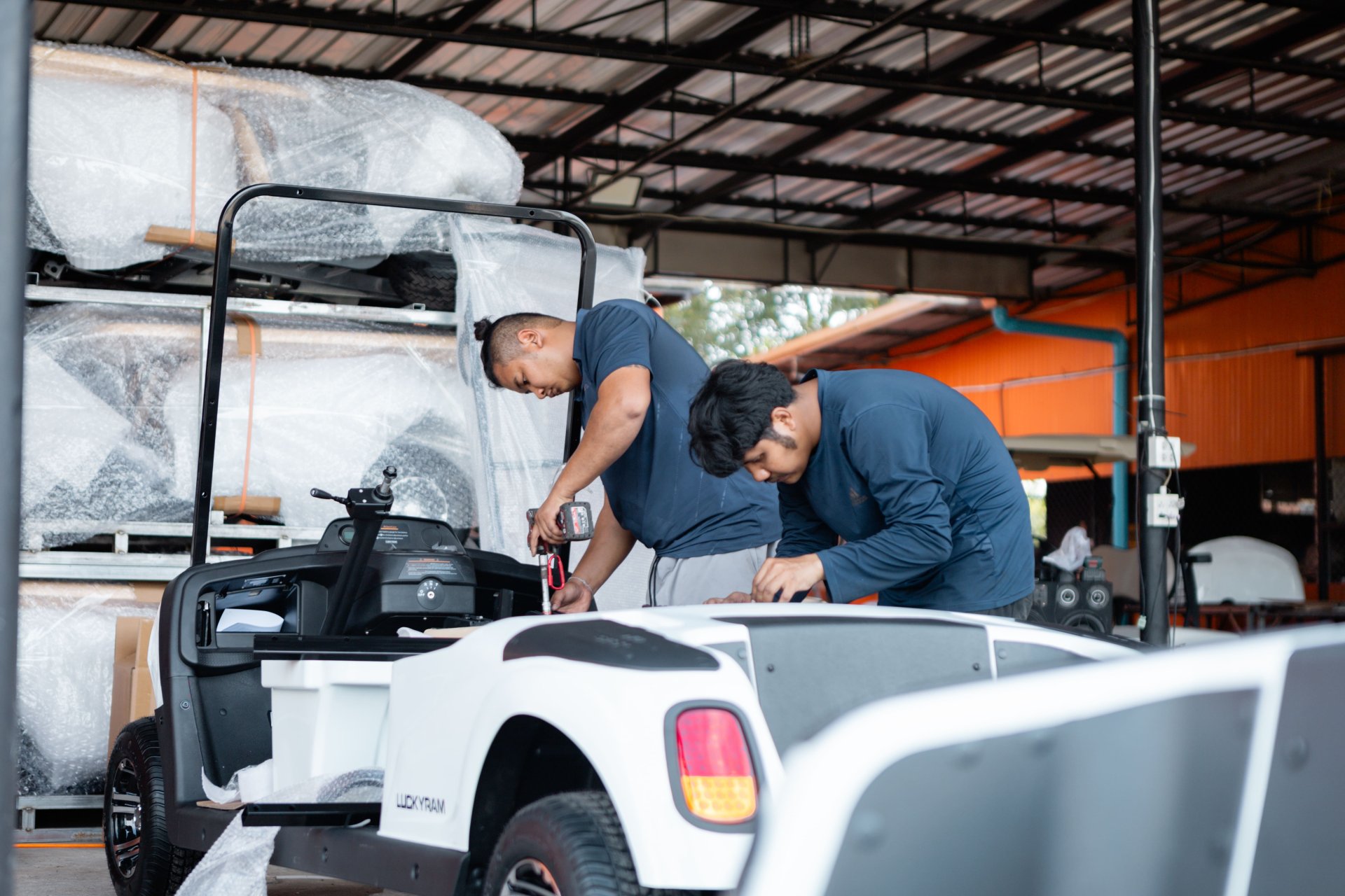 คันที่เห็นในภาพเป็นงานประกอบรถใหม่ทั้งหมดจำนวน 3 คัน ซึ่งทีมช่างของเราดำเนินการตั้งแต่โครงสร้างพื้นรถ ระบบแบตเตอรี่ จนถึงขั้นตอนสุดท้ายคือการตรวจสอบระบบขับเคลื่อน